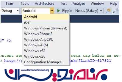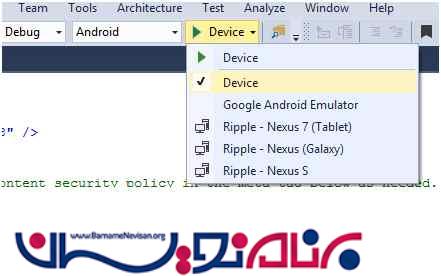 سپس npm و node Js را آپدیت کرده تا کار با موفقیت انجام گیرد. شما می توانید هر پلتفرمی را مانند زیر برای Debug انتخاب نمایید. شما می توانید گزینه های Android یا IOS یا WindowsPhone و غیره را انتخاب نمایید. شما می توانید برنامه پلتفرم های Android و WindowsPhone را به راحتی بسازید اما برای ساخت برنامه IOS باید ابتدا Visual Studio را به یک سیستم MAC متصل نمایید. در اینجا پلتفرم Android انتخاب شده و دستگاه Android توسط کابل USB به کامپیوتر متصل شده است.