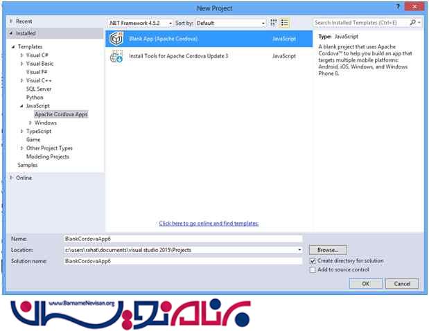 سپس Blank App (Apache Cordova را انتخاب کرده و بعد از نامگذاری روی OK کلیک می کنیم.