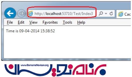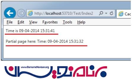 حالا اگر ما برنامه را اجرا کنیم و آن را به متدIndex2 هدایت کنیم می توانیم ببینیم که زمان از صفحه اصلی Cache نمی شود اما زمان آمده از Partial Viee برای 10 ثانیه Cache می شود.