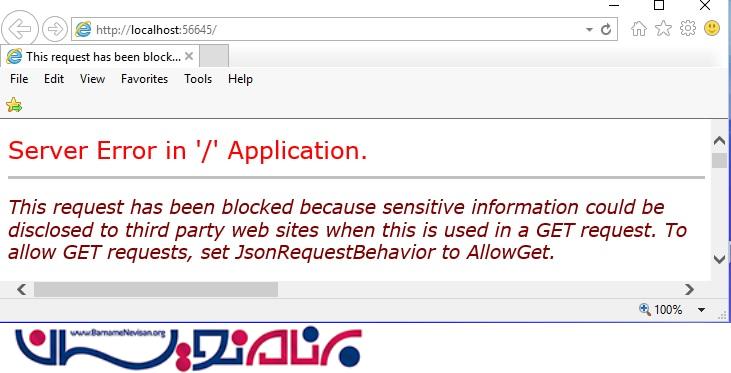 اگر متد Json بدون تنظیم خاصیت JsonRequestBehavior به AllowGet باشد با خطای زیر مواجه خواهیم شد.