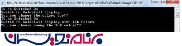 در این کد یک تابع همنام با تابع SwitchOnAndDisplay در کلاس پایه است .در بدنه این تابع کد base. SwitchOnAndDisplay همان تابع از کلاس پایه را اجرا می کند و کارهای دیگری هم در این بدنه به متد افزوده ایم.