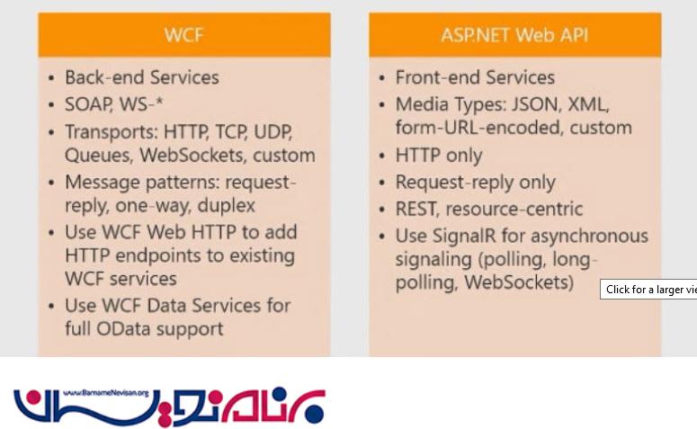 چهارشنبه 22 مهر 1394در این مقاله قصد داریم مطالبی درباره WCF و Web API ارائه دهیم و آنها را بررسی کنیم . در پایان خواهیم دانست که کدامیک از این تکنولوژی ها نسبت به دیگری برتری دارد. همانطور که می دانید تکنولوژی های زیادی وجود دارد که به شما اجازه می دهد تا سرویس هایی را برای ارائه به کاربرهای مختلف ایجاد کنید.