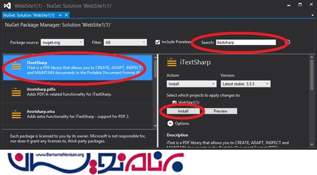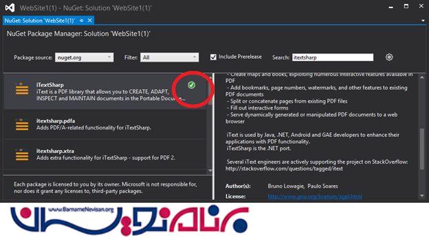 نوع Itextsharp را در کادر جستجو بنویسید پس از جستجو و یافتن ان بر روی دکمه نصب کلیک کنید.