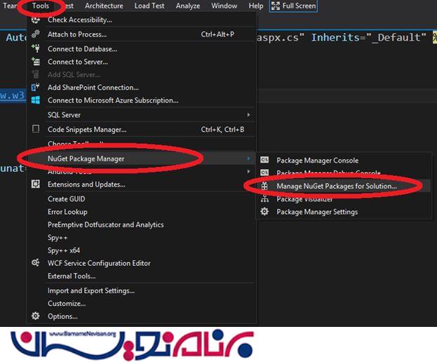 برای اضافه کردن کتابخانه ItextSharp از بسته Nuget استفاده میکنیم مطابق عکس در مسیر Tools گزینه Manage Nuget Package راانتخاب کنید.