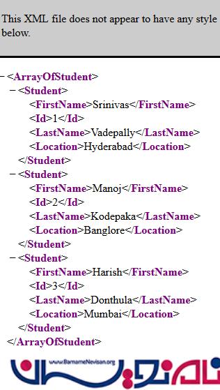 مرحله 5: اگر برنامه را اجرا کنیم می بینیم شی Student را با فرمت XML برمی گرداند، مانند زیر: