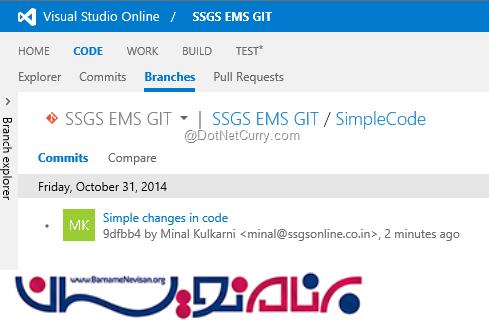 پس از عملیات push عمل vso منعکس می گردد که بر روی code option پروژه های تیمی و نیز جزییات ان عملیات را نشان میدهد.