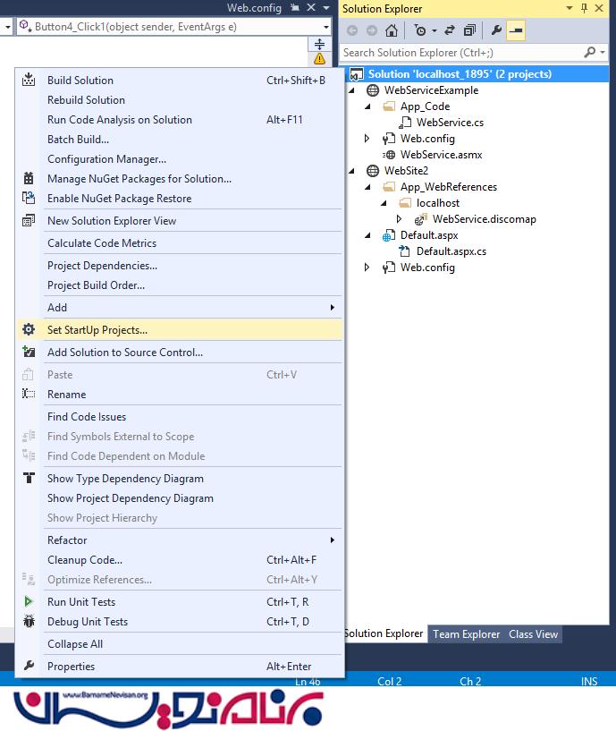 همچنین دقت داشته باشید که برای استفاده از وب سرویس باید روی solution راست کلیک کرده و مانند تصویر زیر عمل نمایید.