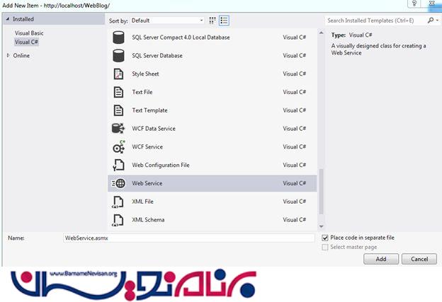 روی نام پروژه کلیک راست کرده و با انتخاب گزینه Add New Item یک وب سرویس با نام Webservice به پروژه اضافه می کنیم.