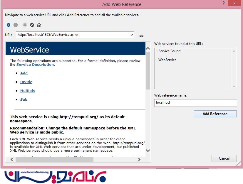 روی دکمه Advanced کلیک کرده و با کپی کردن url از مرورگر آن را در قسمت url پنجره باز شده قرار داده و روی فلش جلوی آن کلیک می کنیم. سرویس به همراه کلیه متدها نمایش داده می شوند. در این قسمت در صورت لزوم نامی برای آن در نظر گرفته و روی Add Reference کلیک می کنیم. حال می بینید که نام سرویس اضافه شده در پوشه Service Reference در Solution Explorer قرار می گیرد.