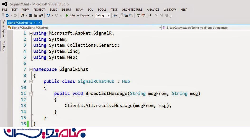 یک کلاس به نام SignalRChatHub که از کلاس Hub ارث می بردکه یک متد به نام BroadCastMessage