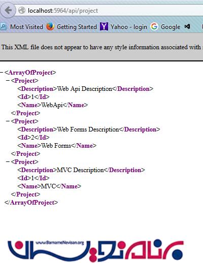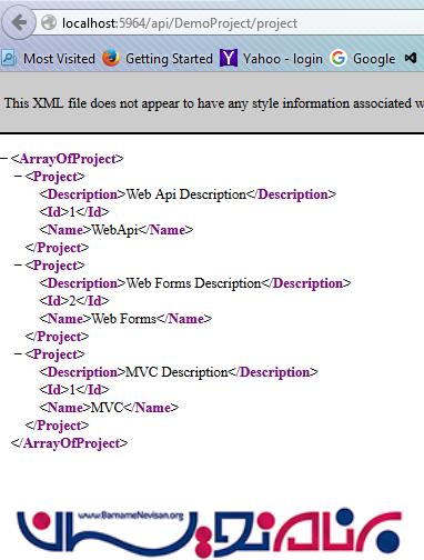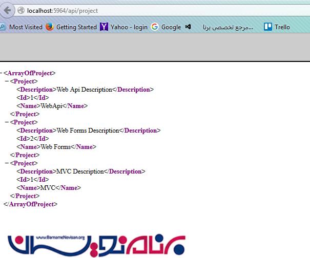 اکنون از آدرس http://localhost:5964/api/DemoProject/Project استفاده کرده و لیستی از Projectهایی که متد FindAll Action فراخوانی می کند بدست می آوریم.