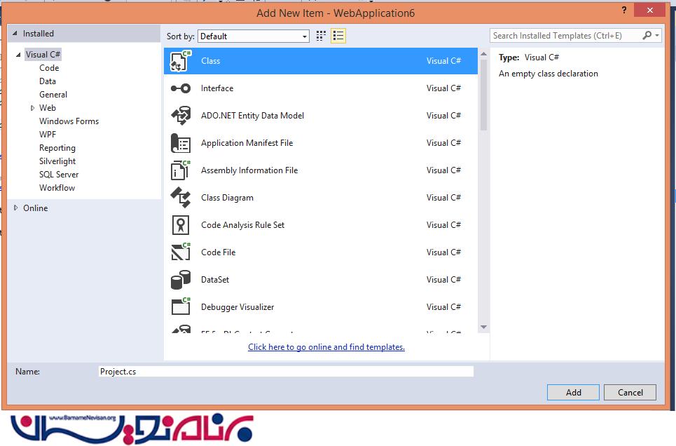 روی پوشه Model راست کلیک کرده و یک کلاس جدید اضافه کرده و نام آن را Project قرار دهید.