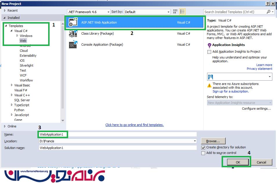 در پنجره New Project مانند تصویر زیر از قسمت Templates گزینه #Visual C سپس "ASP.NET Web Application" را زده و بعد از انتخاب نام برای پروژه روی Ok کلیک می کنیم.