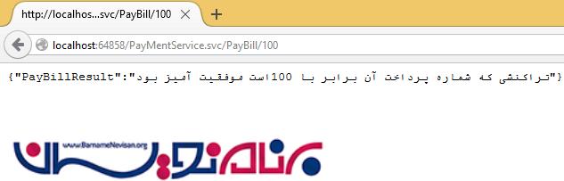 در آدرس بار خود آدرس http://localhost:64858/PayMentService.svc/PayBill/100 را وارد کنید.پاسخی که از WCF REST service داده می شود مانند شکل زیر است .