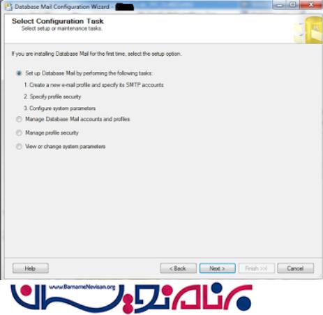 حالا اولین گزینه را انتخاب کرده، تنظیمات Database Mail را به صورت زیر انجام دهید و بعد next را بزنید.