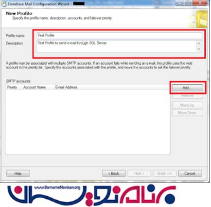 در اینجا نام پروفایل database mail خود را وارد کرده و توضیحات(Description) آن را همانطور که می خواهید بنویسید. در اینجا ما یک " Test Profile" را به عنوان نام پروفایل قرار داده ایم. در بخش حساب کاربری SMTP، گزینه Add account را انتخاب کنید تا یک حساب کاربری جدید مانند شکل زیر ایجاد شود: