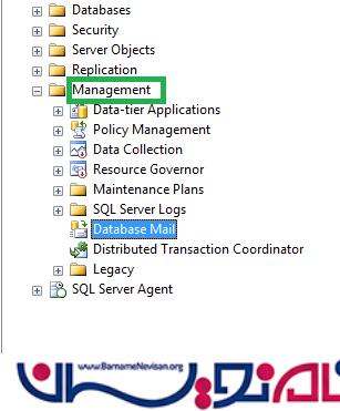 گزینه Expand و بعد Management را کلیک کنید، در این قسمت می توانید گزینه Database Mail را پیدا کنید، مانند شکل زیر:
