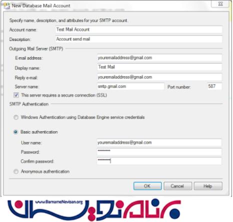 حالا در پنجره New Database Mail Account جزییات را مانند شکل زیر پر کنید: