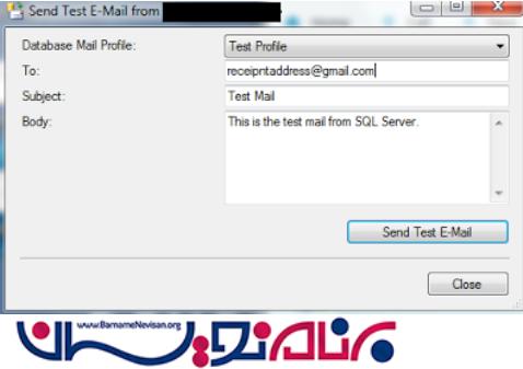 Test Profile را به عنوان پروفایل Database Mail از Dropdown انتخاب کنید و آدرس ایمیل، موضوع و بدنه متن را وارد کنید و Send Test E-Mail را کلیک کنید. حالا ایمیل شما با موفقیت از SQL Server ارسال می شود.