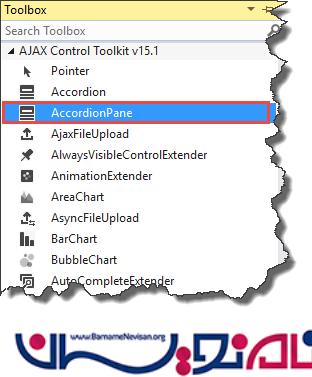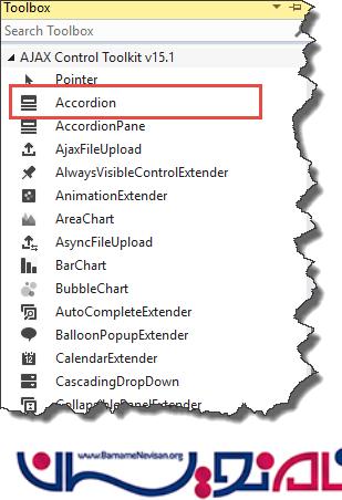 3- به بخش AJAX Control Toolkit در ToolBox رفته و کنترل Accordion را به Default.aspx اضافه کنید.