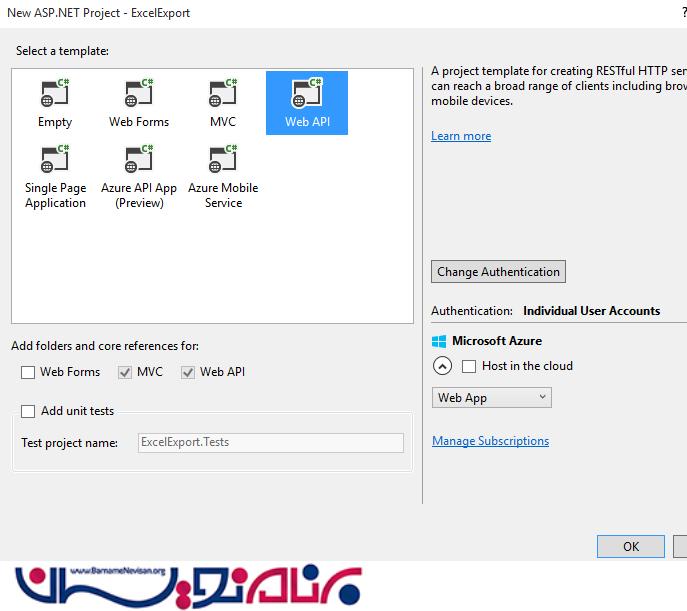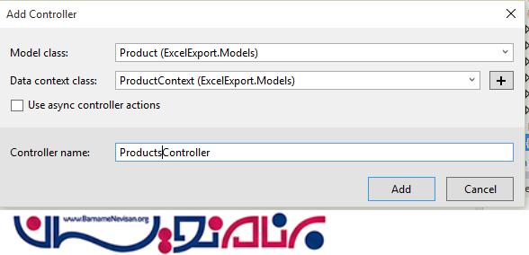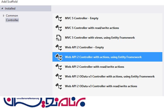 حالا روی Controller راست کلیک کرده، و یک WebApi که از EntityFramework استفاده شده باشد می سازید.