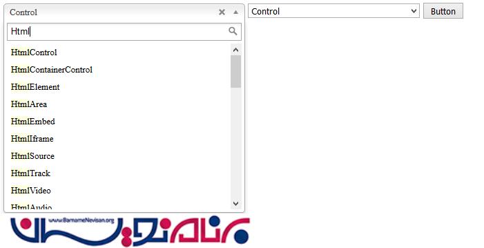در این جا DropDownList سمت راست از کنترل های معمولی ASP است و سمت چپ ChosenDropDownList می باشد که برای مقایسه ویژگی ها قرار داده شده است، همانطور که می بینید در ChosenDropDownList امکان جستجوی بخش ها وجو دارد. به صورت زیر: