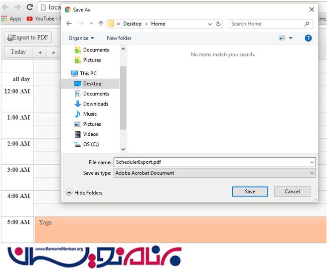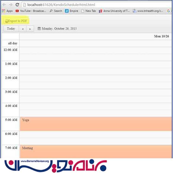 این یکی از ویژگی های بسیار جذاب در Kendo Scheduler است که می تواند رخدادها را با اضافه کردن فقط یک toolbar (نوار ابزار) و صفت pdf در اسکریپت به صورت PDF به خروجی ارسال کند.