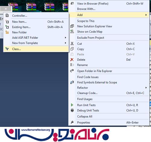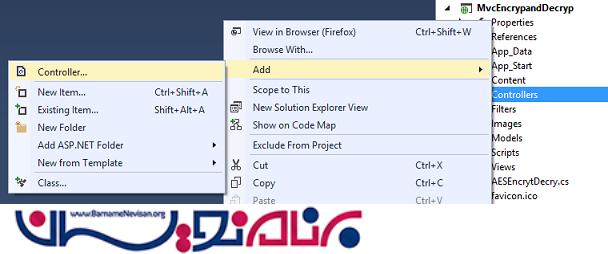 برای اضافه کردن کنترلر بر روی پوشه Controller راست کلیک کرده و Add->Controller را انتخاب کنید: