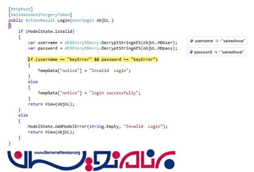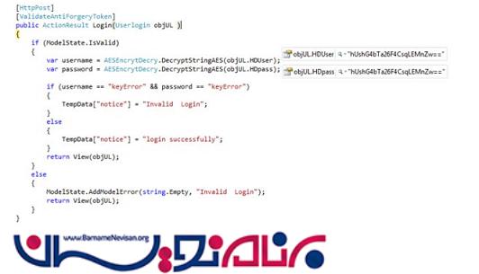در اینجا [HttpPost] مقادیری را از فیلدهای مخفی می گیرد و آنها را به کلاس AESEncrytDecry متد DecryptStringAES می فرستد جایی که مقادیر رمزگشایی خواهند شد.فرستادن مقادیر به این متد به صورت زیر است: