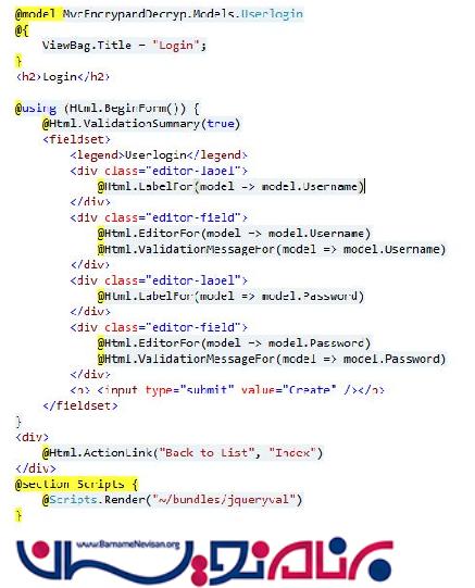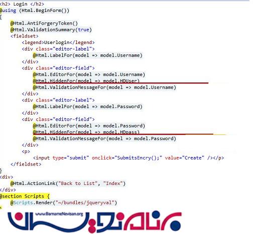 در اینجا فیلدها را به فرم ها اضافه می کنیم و کدهای جاوا اسکریپت را برای رمزنگاری داده روی دکمه ارسال (Submit) می نویسیم: