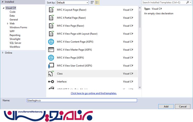 برای اضافه کردن مدل بر روی پوشه Model راست کلیک کرده و از لیست ظاهر شده Add Class را انتخاب کرده و نام آن را UserLogin.cs قرار دهید. مانند تصویر زیر:
