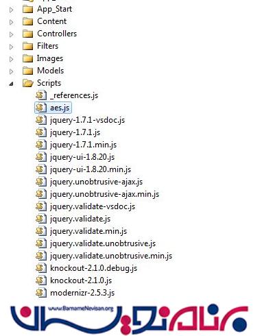 بعد از اضافه کردن View حالا فایل جاوا اسکریپت مربوط به AES را به پوشه script اضافه می کنیم. برای اضافه کردن آن فقط فایل aes.js در پوشه scripts قرار دهید. برای درک بهتر تصویر زیر را ببینید: