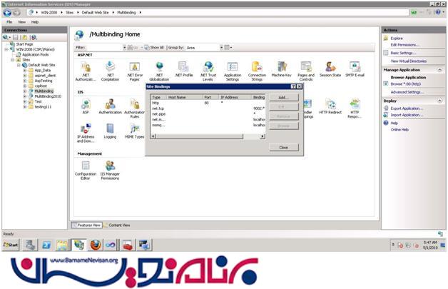 قدم چهارم: بر روی default Website راست کلیک کنید و Edit binding را انتخاب کنید. مطمئن شوید که اطلاعات پروتکل net.tcp اینجا هست.
