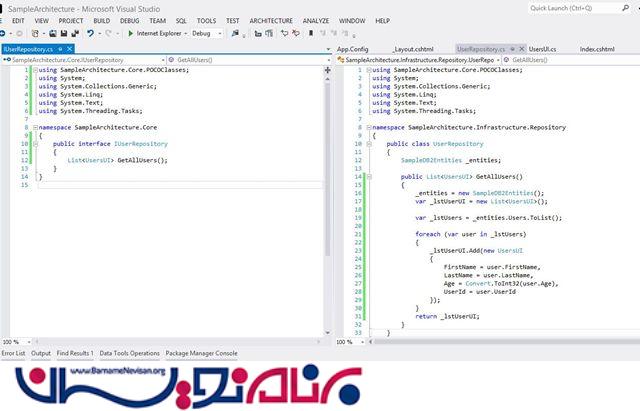 حالا ما یک Repositoryاضافه می کنیم و متد GetAllMethod را اضافه می نماییم.و رابط را در کلاس UserRepository تعریف می کنیم ، دوباره همان سوال اضافه کردن رابط است و پاسخ آن است که آن یک جز قابل استفاده ی مجدد است ، و باید یک جز مستقل باشد، بنابر این ما آن را به صورت نمونه به Architecture.Core اضافه می کنیم