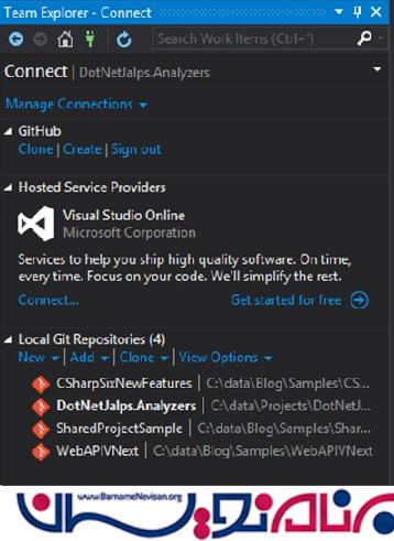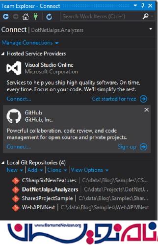 با این امکان می توانید به طور مستقیم با مخازن Github خود در تعامل باشید. برای آشنایی بیشتر می توانید مقاله "Share کردن کد در GitHub توسط Visual Studio 2013" را نیز مطالعه کنید. کار با Github در حال حاضر آسان نیست.