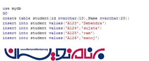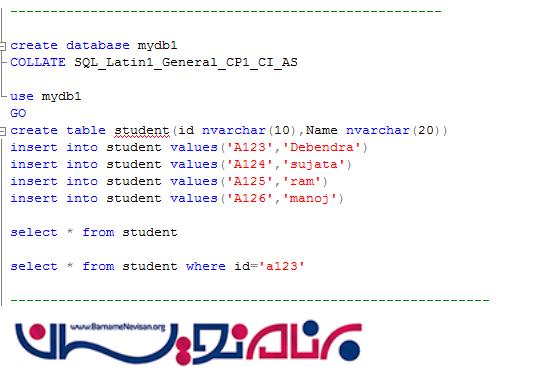در کد زیر یک جدول با چندین مقدار ساخته شده است . Collation این دیتابیس بر روی case sensitive قرار داده شده است .