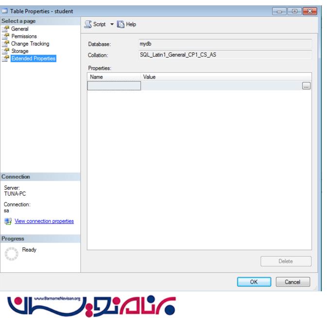 برای تغییر Collation بر روی جدول کلیک راست کنید.به گزینه Property بروید و سپس بر روی extended property کلیک کنید.به شکل زیر توجه کنید