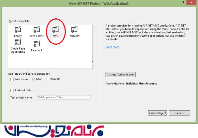 ویژوال خود را باز نمایید و یک پروژه ی جدید از نوع asp.net mvc 5 بسازید، به صورت زیر: