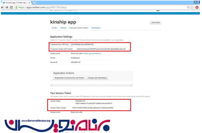 در ادامه به زبانه(تب) " Keys and Access Tokens " رفته و بر روی دکمه Create token کلیک کنید و Access Token و Access Token Secret را دریافت کنید. توجه داشته باشید که API Key و API Secret زمانی مورد نیاز است که احراز هویت در برنامه ASP.NET MVC شما فعال شده باشد: