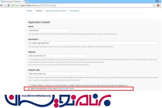 بعد از این که برنامه ایجاد شد، بر روی زبانه Setting کلیک کرده و گزینه "Allow this application to be used to Sign in with Twitter" را کنترل کنید.