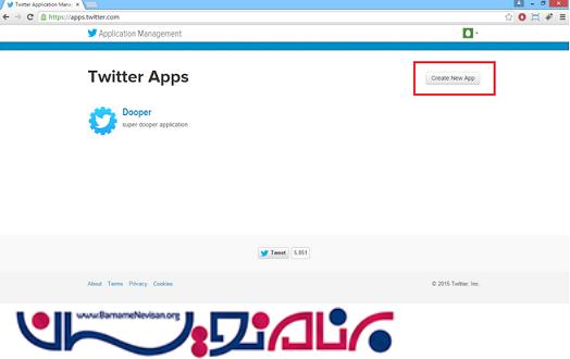 برای ایجاد یک برنامه کاربردی در Twitter گزینه apps.twitter را دنبال کنید، شما نیاز دارید تا بخش مدیریت برنامه را از پورتال توسعه دهنده Twitter انجام دهید. اگر شما هنوز به سایت وارد نشده اید، حالا sign in کنید. بر روی دکمه Create New App کلیک کنید: