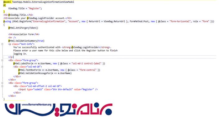 View زیر از مدل ExternalLoginConfirmationViewModel استفاده می کند، که رابط کاربر برای جمع آوری و ذخیره سازی اطلاعات کاربر است: