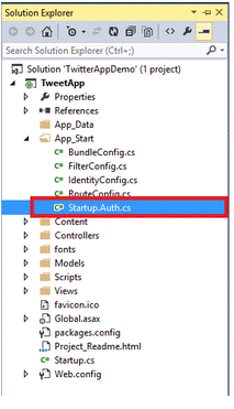 برای احراز هویت شخص ثالث، اول از همه نیاز به فعال سازی provider احراز هویت Twitter در کلاس Startup داریم. به پوشه App_Start پروژه خود رفته و فایل Startup.Auth.cs را انتخاب کنید: