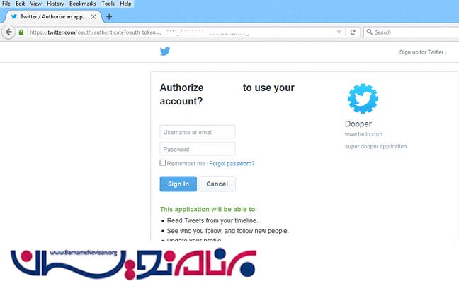 اطلاعات کاربری را با کلیک روی دکمه sign-in پر کرده و به برنامه خود بازمی گردید، در این حالت اطلاعات خصوصی twitter را نیز دارید.