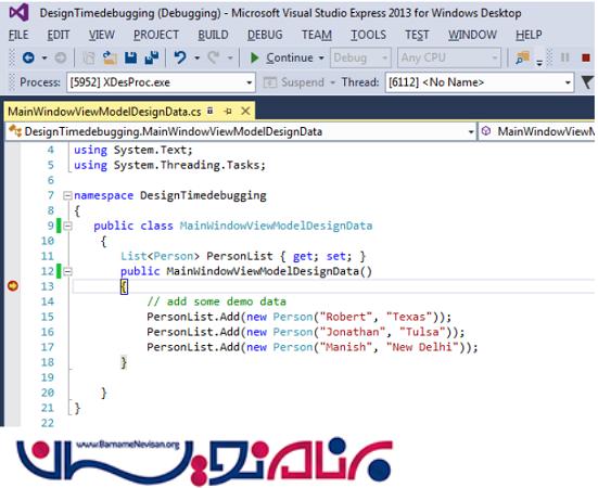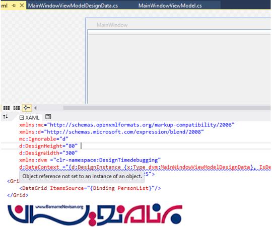 10. در اینجا شما خصوصیت PersonList نمونه سازی شده ندارید که باعث رخداد استثنای NullReference در WPF Designer می شود. بعد از اصلاح آن خواهید دید که هم اکنون designer داده ها را به خوبی نمایش می دهد.