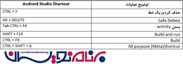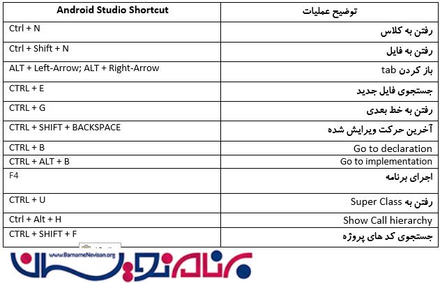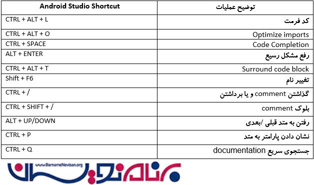 این کلیدهای میان بر برای نرم افزار Android Studio است.