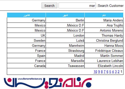 کد HTML زیر شامل یک کنترل ASP.Net GridView، یک TextBox و یک Button است. GridView توسط رکوردهای جدول Customers از پایگاه داده Northwind با استفاده از SqlDataSource پر شده است.