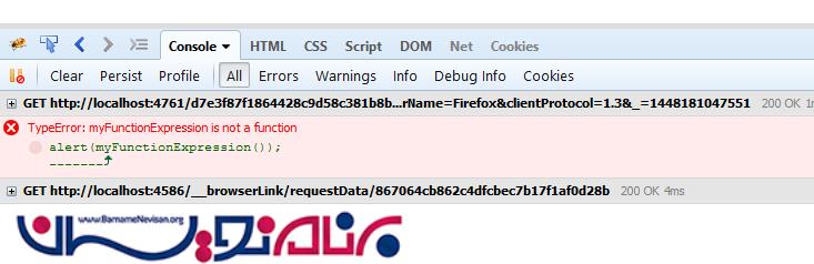 همان طور که می بینید به جای دادن alert ، یک خطا خواهیم داشت .در کنسول FireBug می توانید این خطا را ببینید.