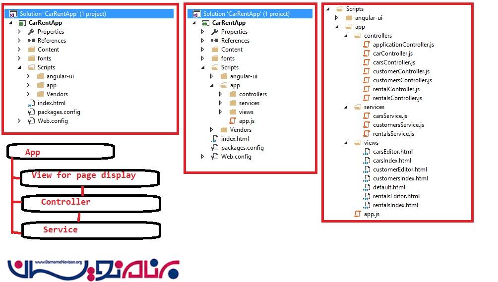 منوی اصلی ما شامل سه پیوند به سه view اصلی اجاره،مشتریان و ماشین میباشد. خوشبختانه Angular Js از این ویژگی پشتیبانی میکند. د رحال حاضر در فایل Index.Html از دستورات ngview استفاده می کنیم. این دستورات می خواهد View منطبق بر مسیر فعلی را ارائه دهد. و شما میتوانید تنها یک برنامه Angular Js داشته باشید. اخرین مرحله پیکربندی مسیر ها در بخش پیکربندی ماژول نرم افزار با تنظیم انها با مولفه RouteProvider$ در App.Js میباشد .