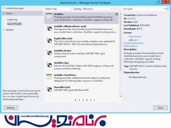 حالا یک پنجره جدید مشاهده می کنید، در اینجا MVC grid را جستجو کنید. و بعد آن را نصب کنید: